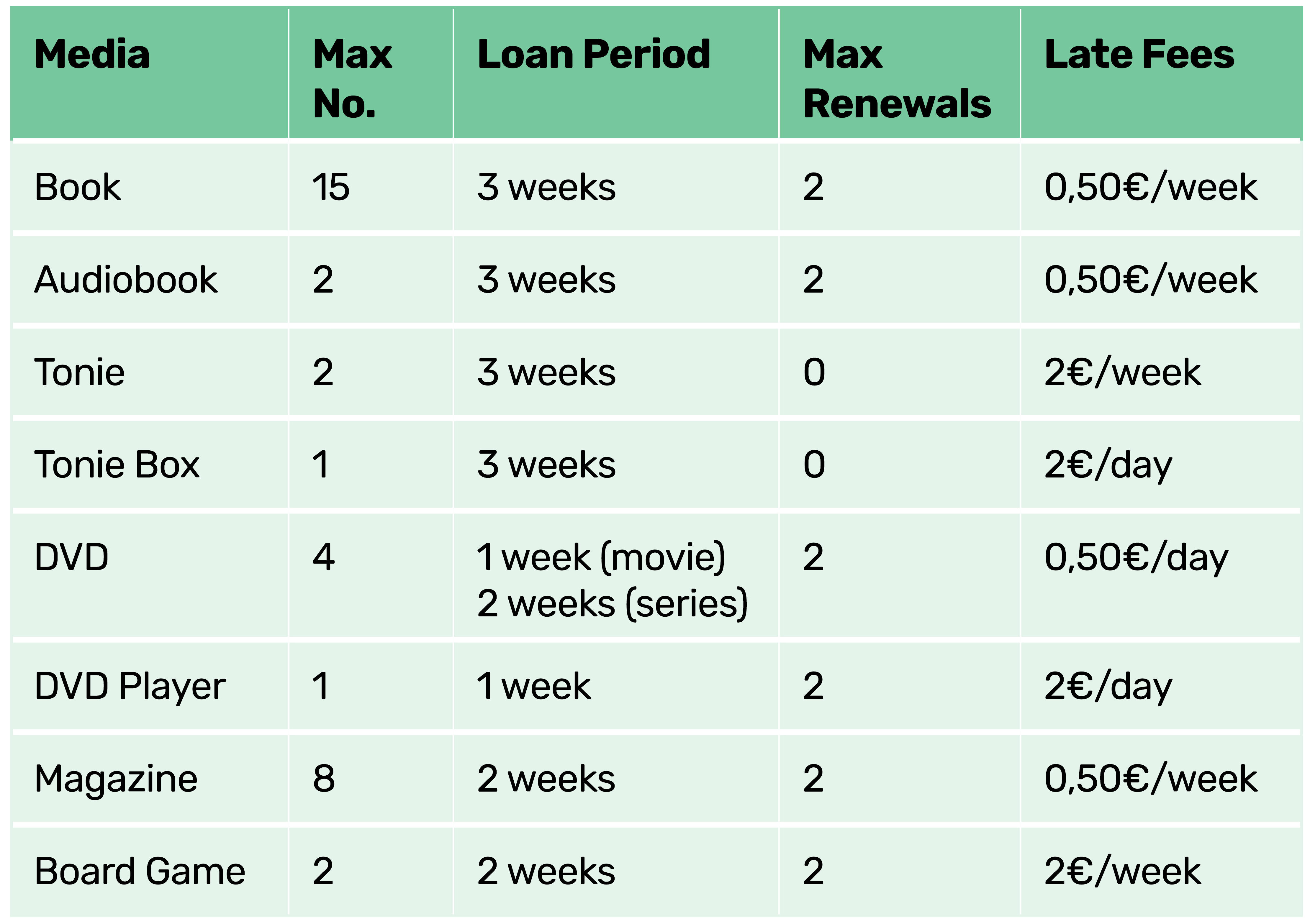 You can extend your borrowed media at any time via our online catalog, provided they have not yet been reserved by other users.